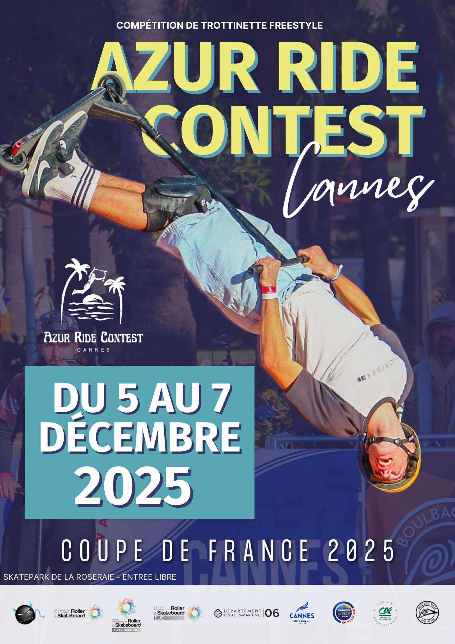 La seconde édition de l’Azur Ride Contest aura lieu les 5, 6 et 7 décembre 2025 au skatepark du front de mer de Cannes. Mêlant sport de haut niveau et sport pour tous, cet événement unique sur la Côte d’Azur, ne rassemblera pas moins de 100 athlètes repartis en plusieurs catégories sportives dont les meilleurs riders de la région ! L’objectif est de faire découvrir la trottinette (scooter) freestyle à son plus haut niveau en rendant cette compétition accessible à tous et à toutes, et à tous les niveaux. Pour sa 2nd édition, l’Azur Ride Contest se déroulera dans le cadre de la Coupe de France de Trottinette Freestyle BOWL intégrant ainsi le calendrier fédéral de la Fédération FFRS.
